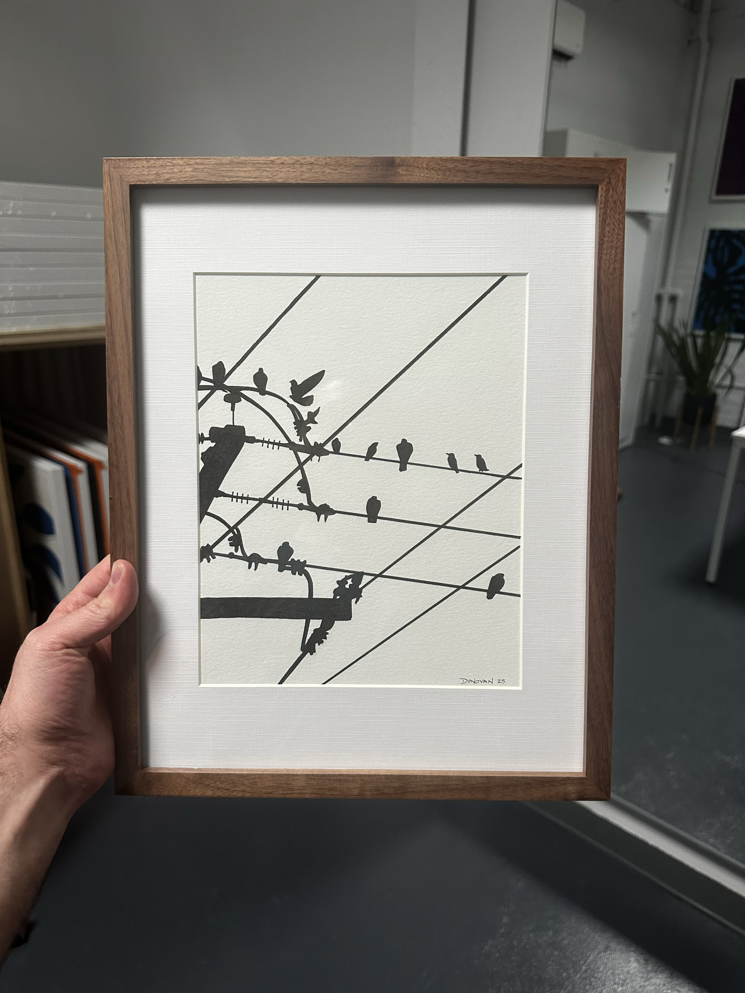 Ink drawing of pigeons on phone wires. (Original drawing)